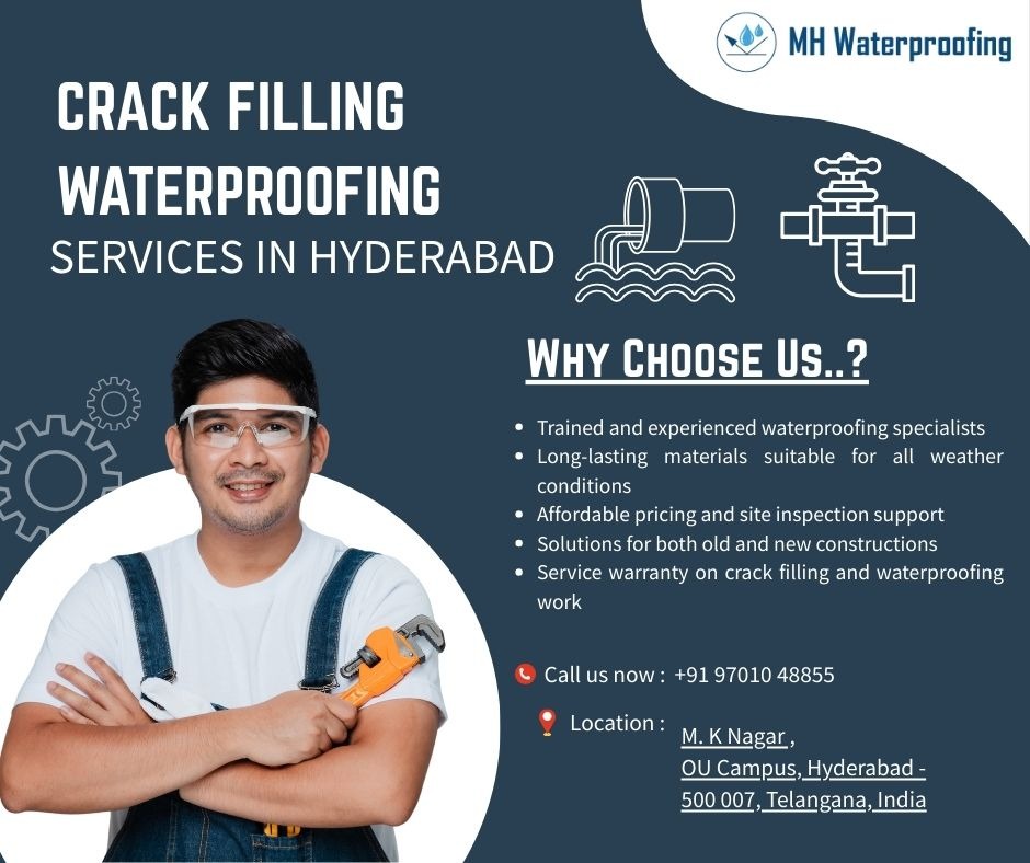 professional Crack Filling Waterproofing Services in Hyderabad instead of temporary surface patching. At MH Waterproofing Services, we provide specialized Crack Filling Waterproofing Services in Hyderabad that focus on identifying the root cause of cracks, cleaning the damaged area, filling the gaps with durable materials, and providing long-term waterproofing protection. Our experienced team ensures that every crack is treated with the right method, whether it is a hairline crack, structural crack, or a surface-level expansion crack.